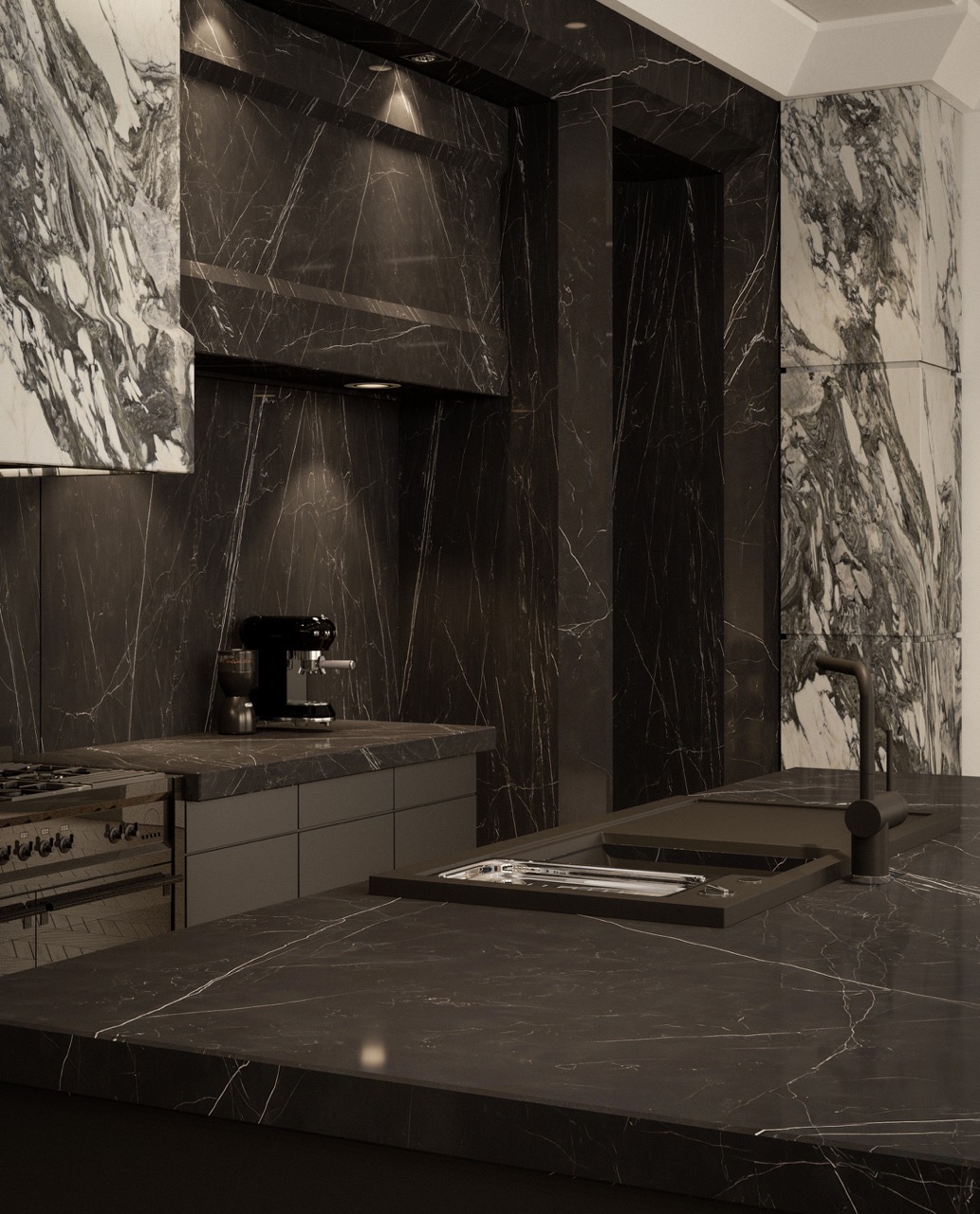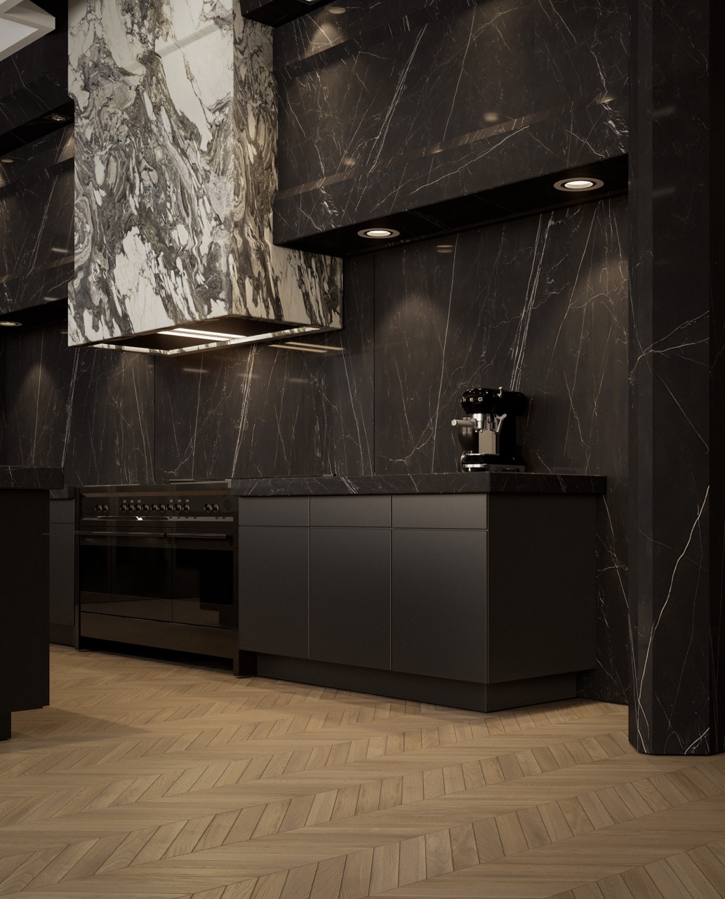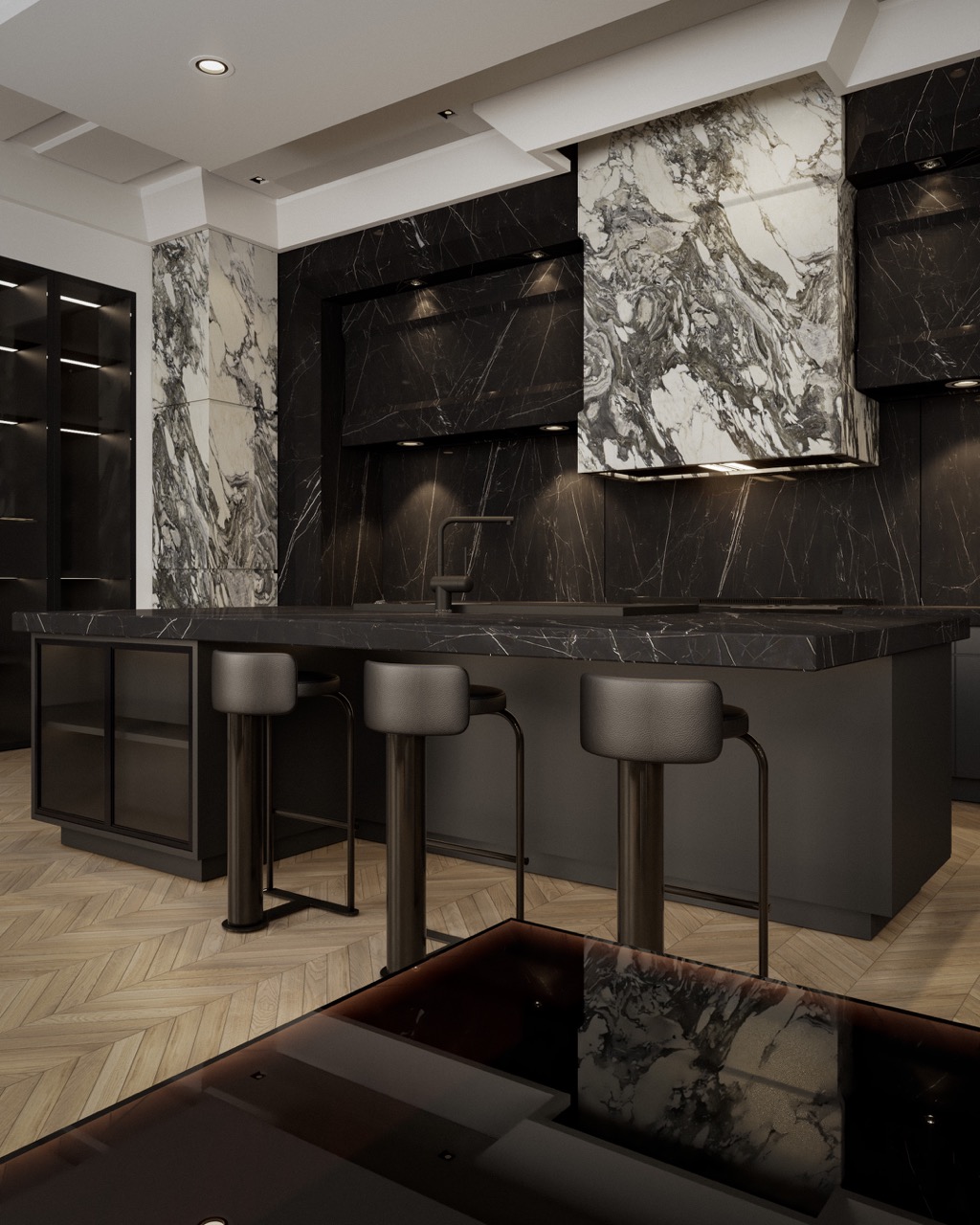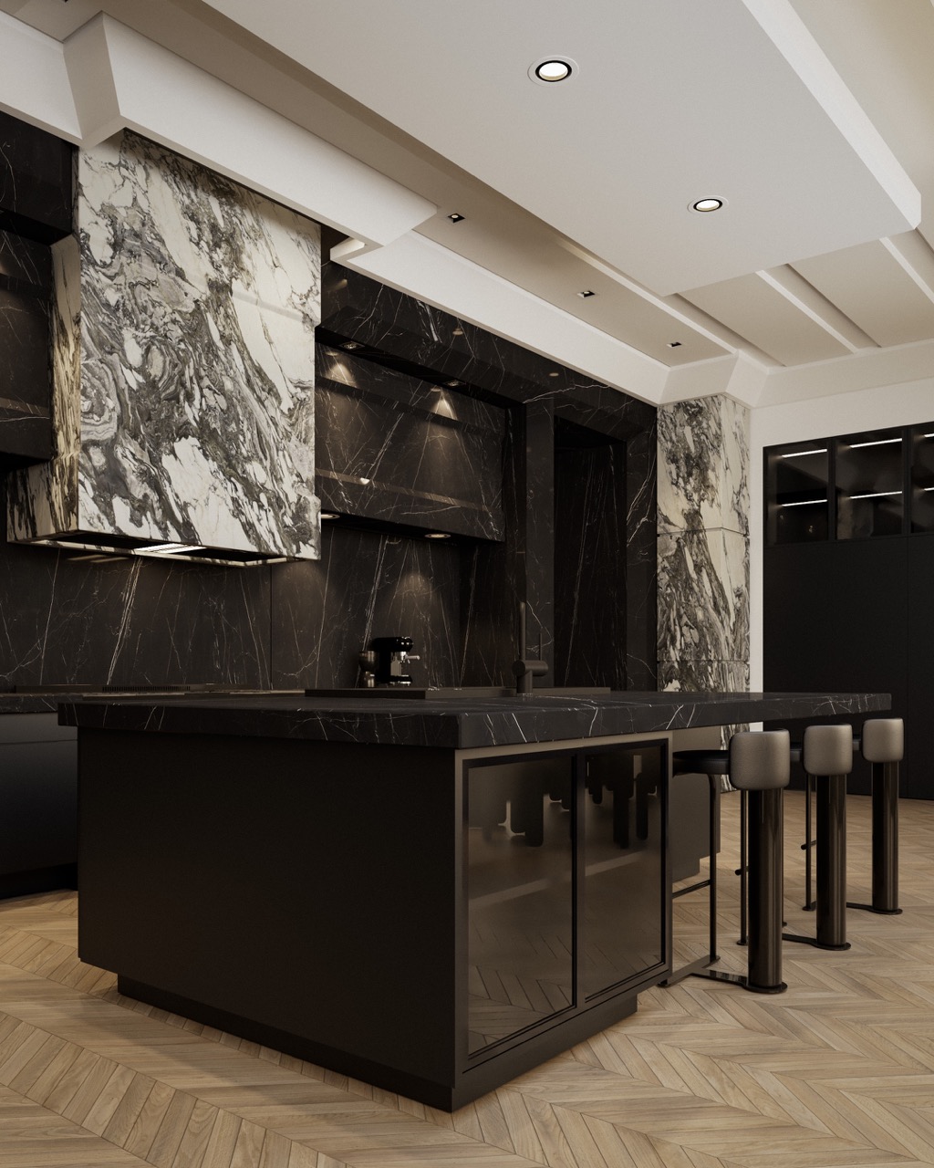Nero Marquina island, sculptural Arabescato hood, veined stone wall cladding — each mineral mass holds its role. Herringbone oak, matte black cabinetry, leather seating and three-level integrated lighting compose a kitchen fully articulated through its materials.