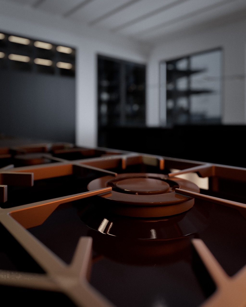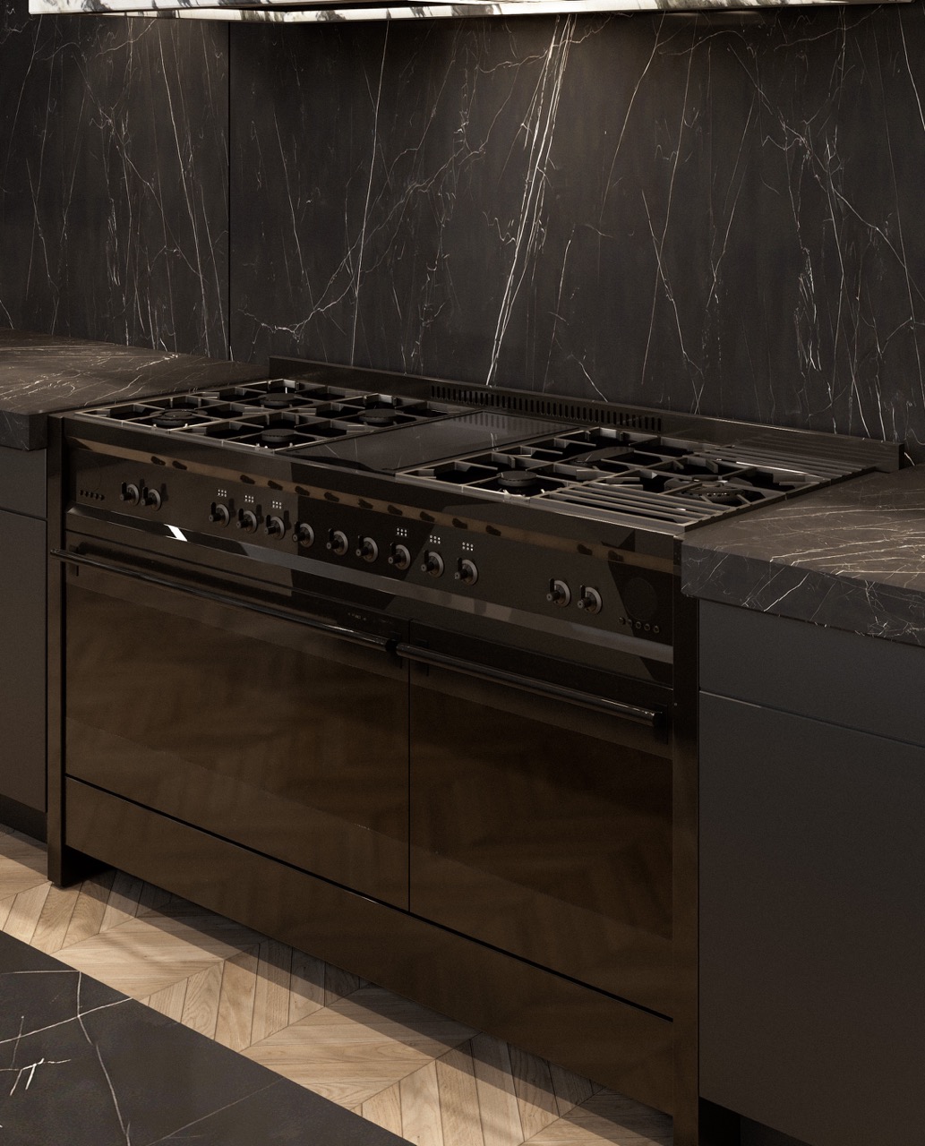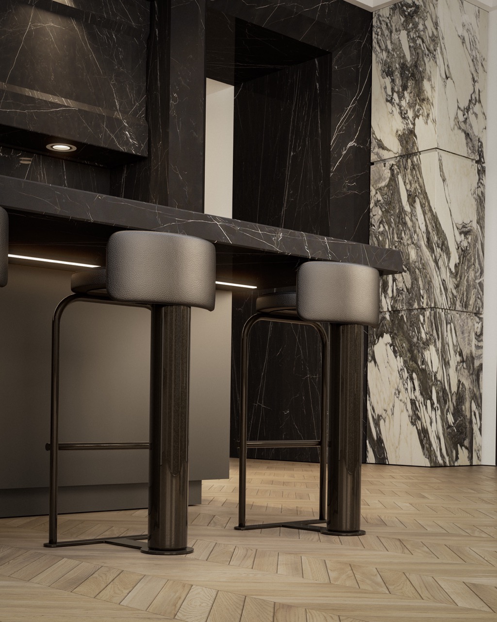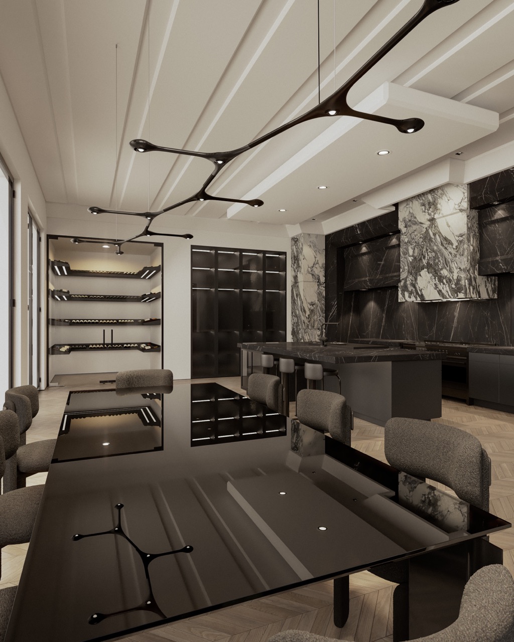 Nero Marquina island, sculptural Arabescato hood, veined stone wall cladding — each mineral mass holds its role. Herringbone oak, matte black cabinetry, leather seating and three-level integrated lighting compose a kitchen fully articulated through its materials.