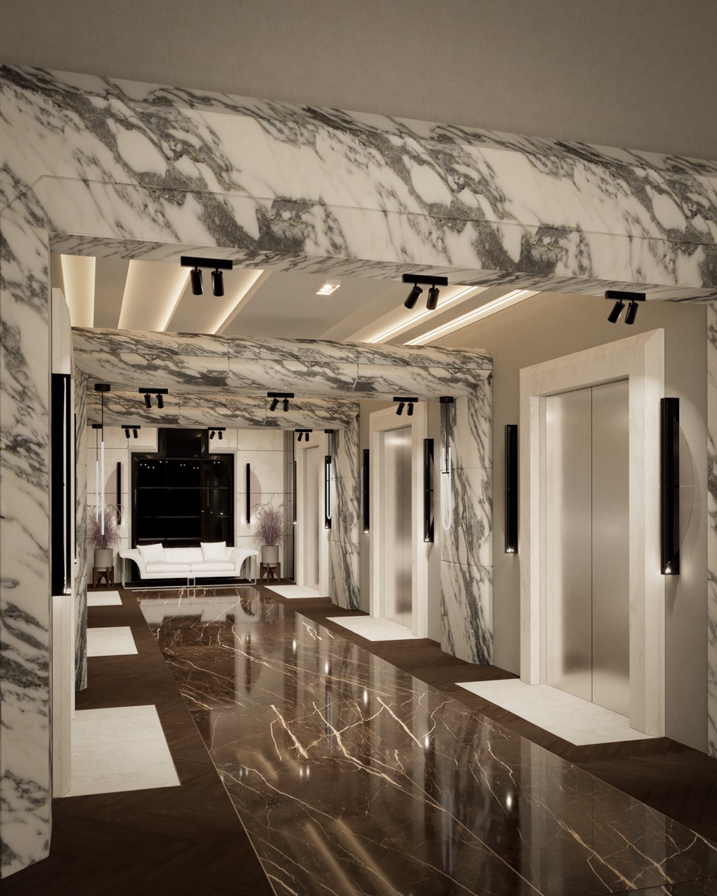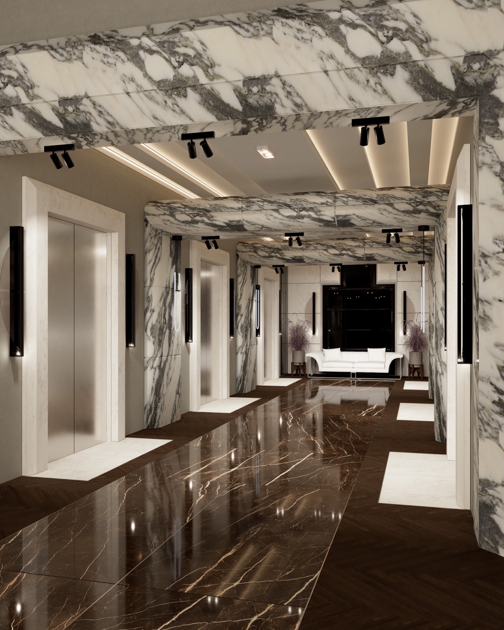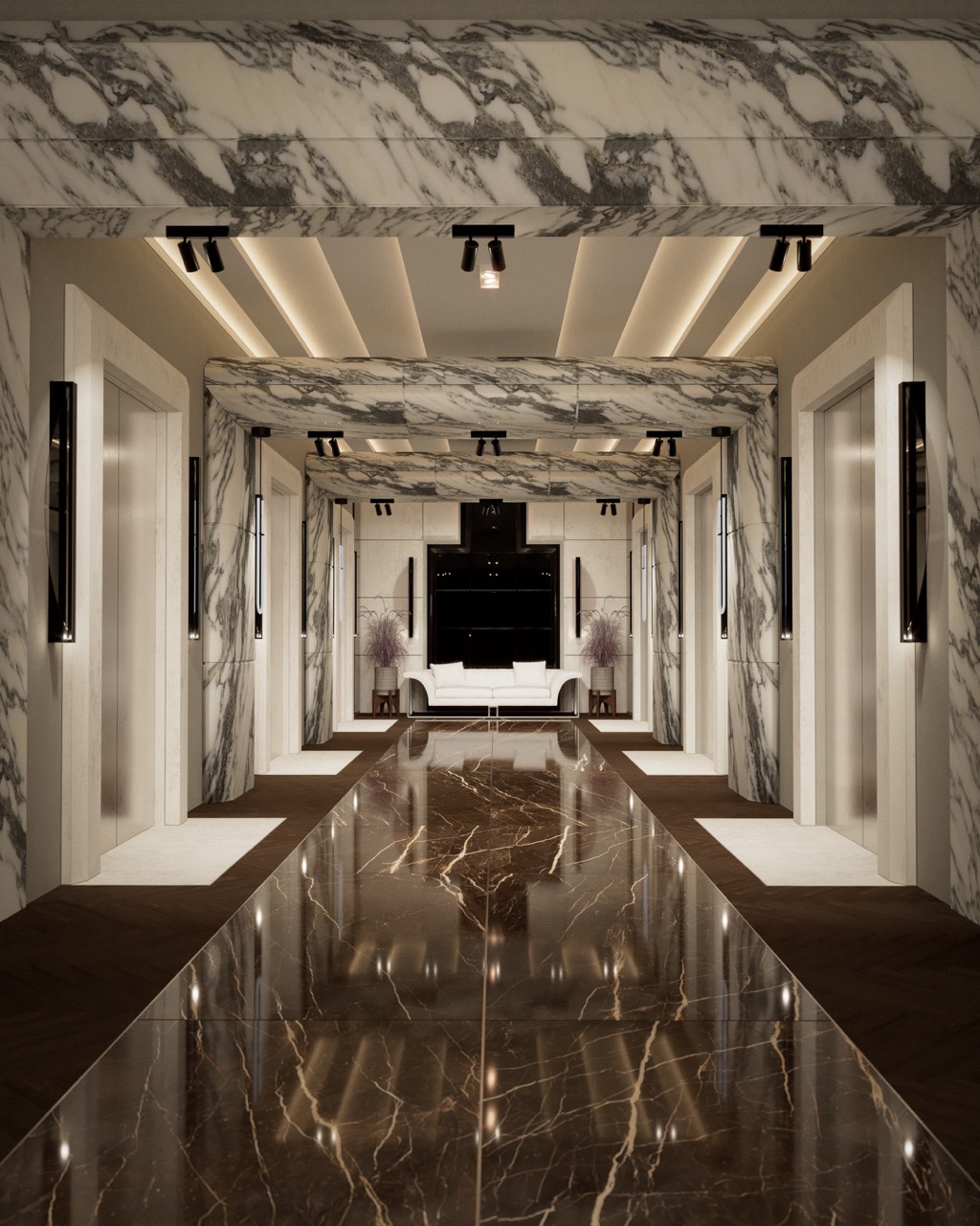 A hotel corridor structured through symmetry and repetition — a sequence of marble portals guides movement along a central axis. Polished dark marble and herringbone wood compose the floor, integrated lighting — linear LEDs, directional spots, vertical fixtures — enhances volumes and textures. A restrained architectural language where rhythm, precision and material define a controlled, immersive atmosphere.