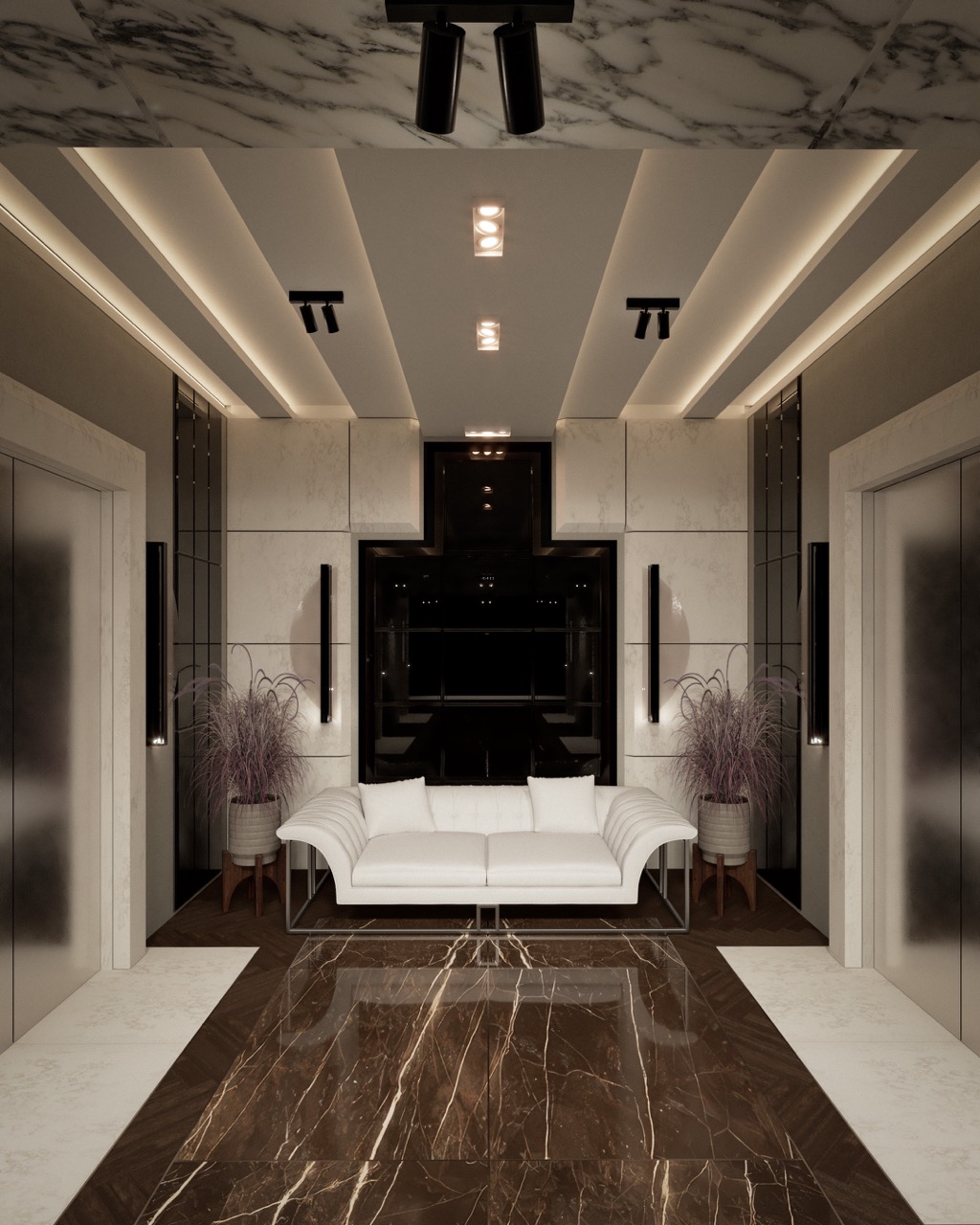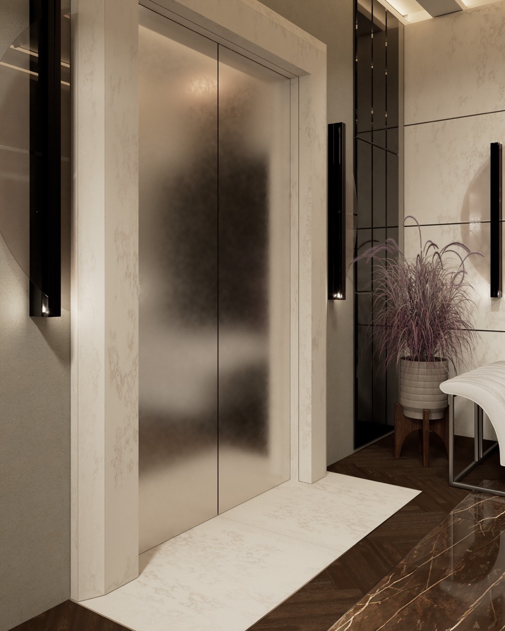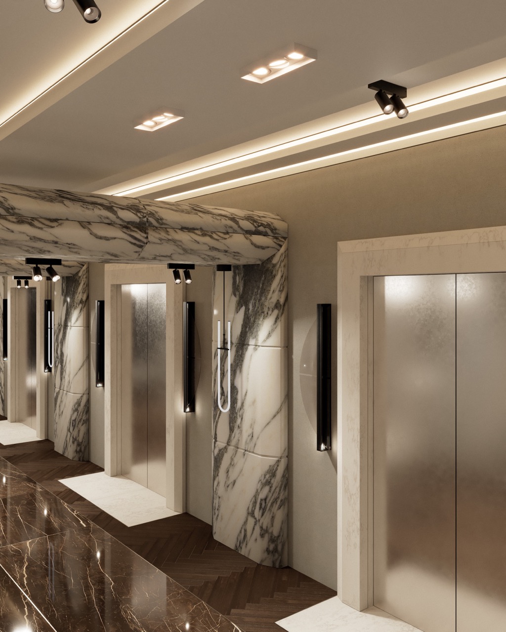 A hotel corridor structured through symmetry and repetition — a sequence of marble portals guides movement along a central axis. Polished dark marble and herringbone wood compose the floor, integrated lighting — linear LEDs, directional spots, vertical fixtures — enhances volumes and textures. A restrained architectural language where rhythm, precision and material define a controlled, immersive atmosphere.
