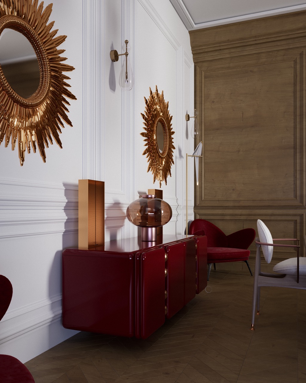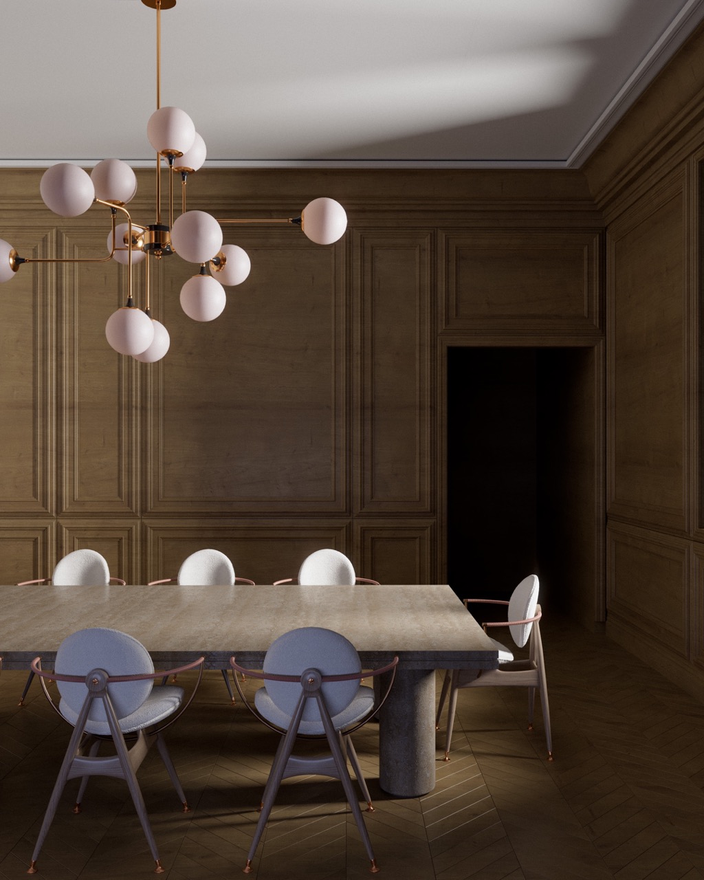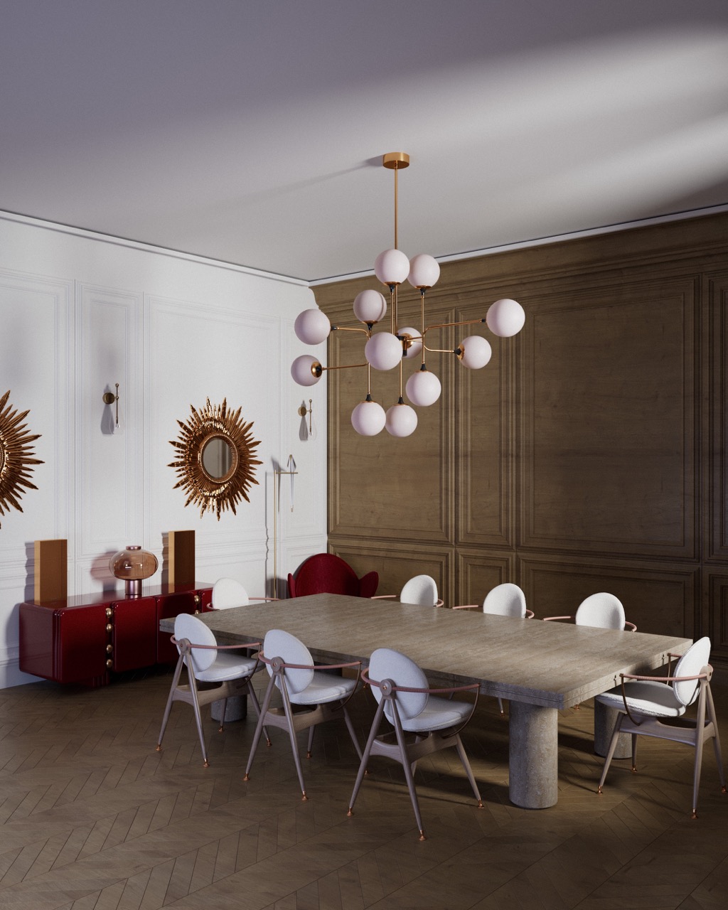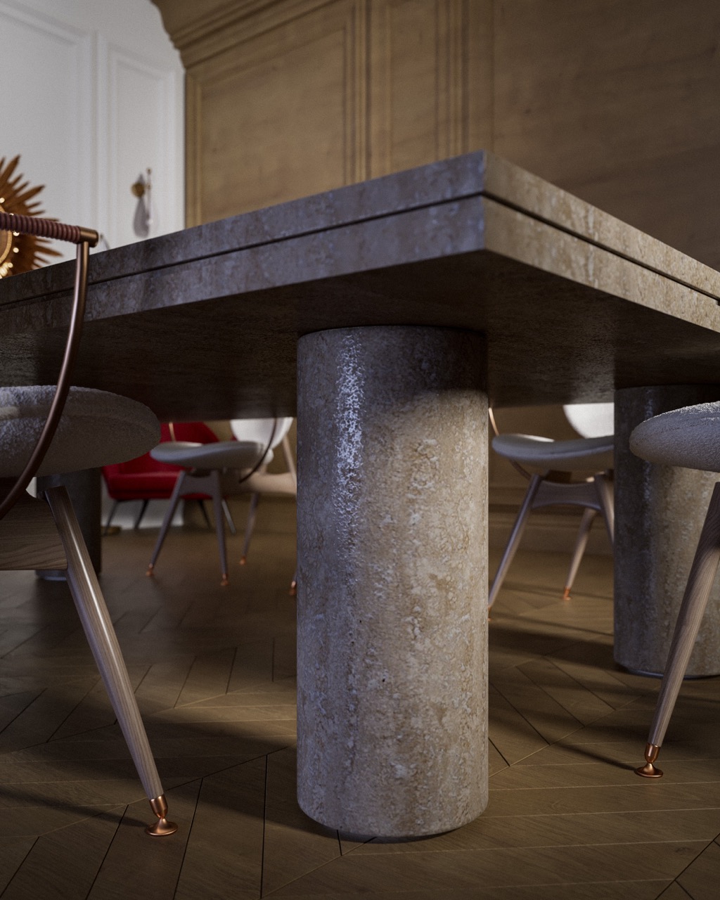 Haussmann architecture — molded walls, wood paneling, herringbone flooring — as classical foundation. Sculptural, lacquered and radical furniture introduced in deliberate contrast. The tension between tradition and modernity, mineral mass and lightness, matte and reflective structures every view. Light reveals textures and defines the atmosphere with precision.