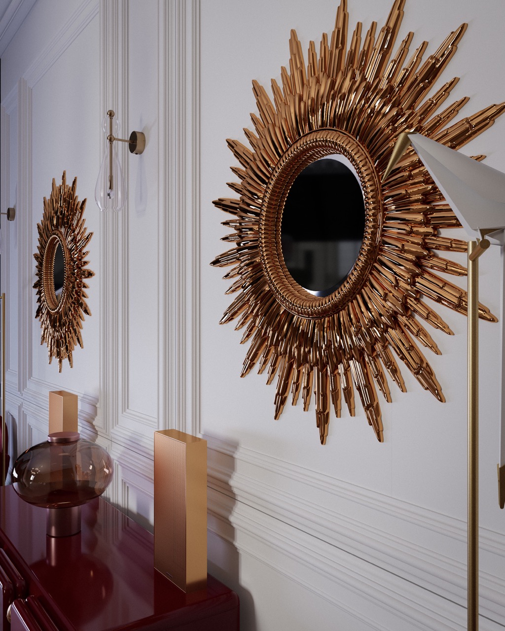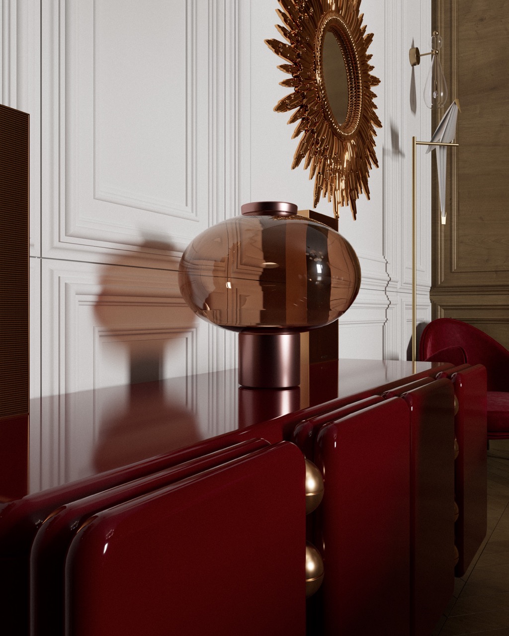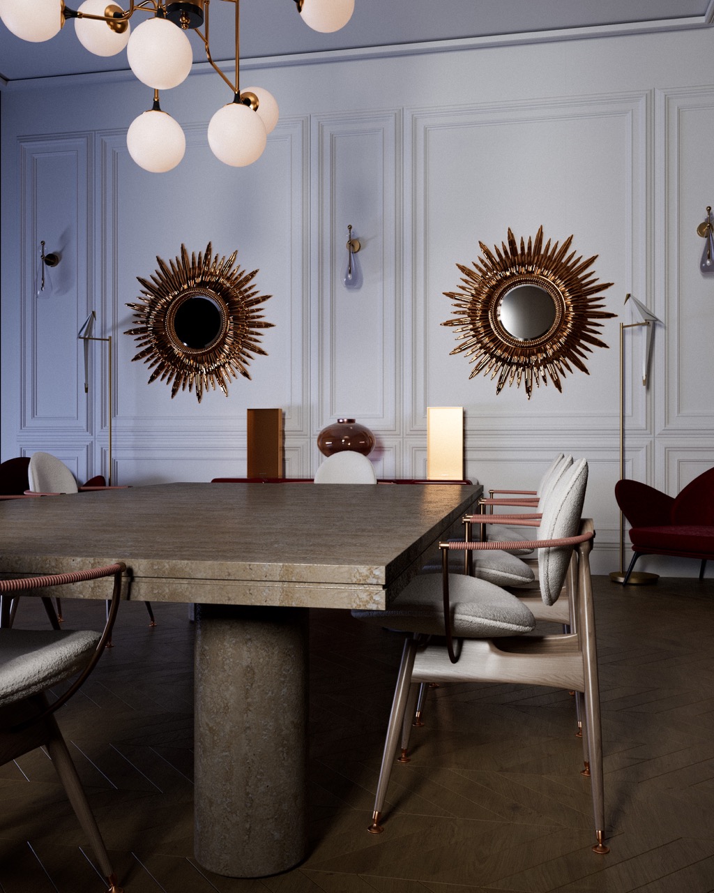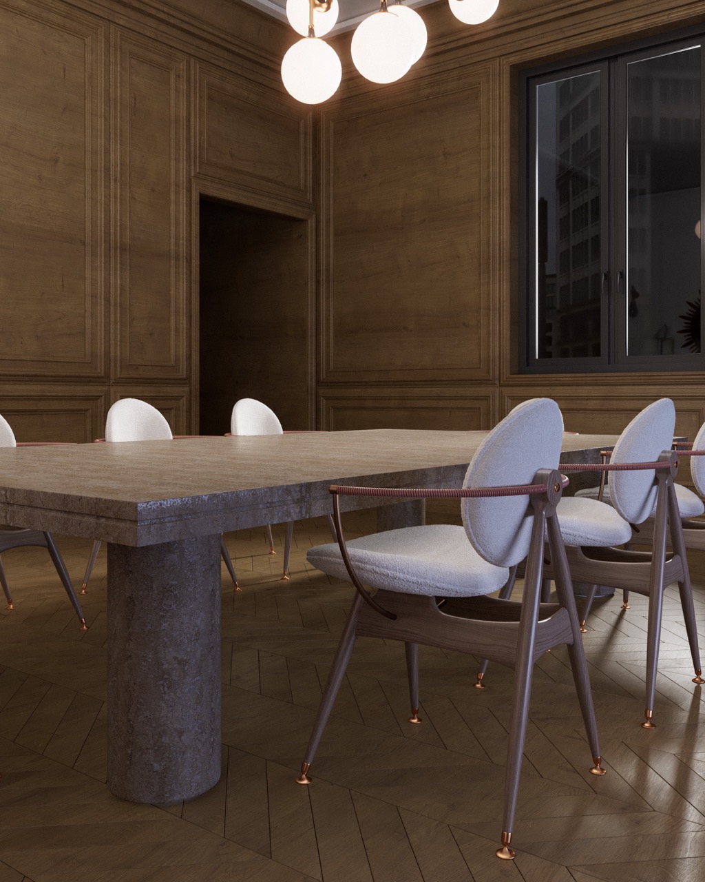 Haussmann architecture — molded walls, wood paneling, herringbone flooring — as classical foundation. Sculptural, lacquered and radical furniture introduced in deliberate contrast. The tension between tradition and modernity, mineral mass and lightness, matte and reflective structures every view. Light reveals textures and defines the atmosphere with precision.