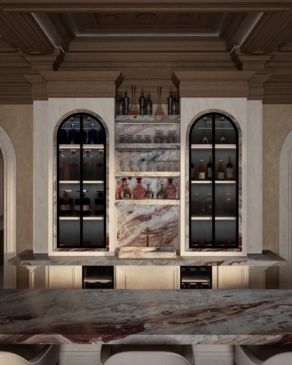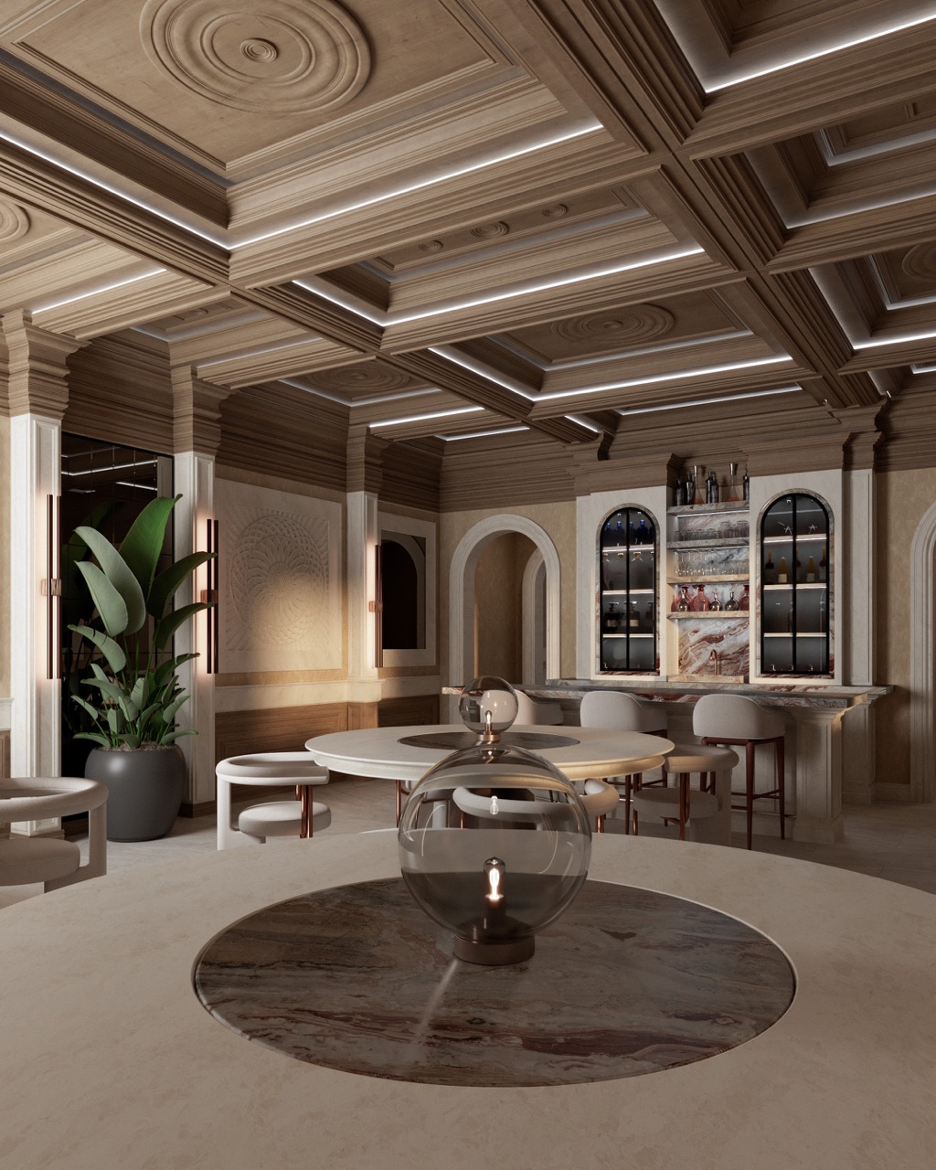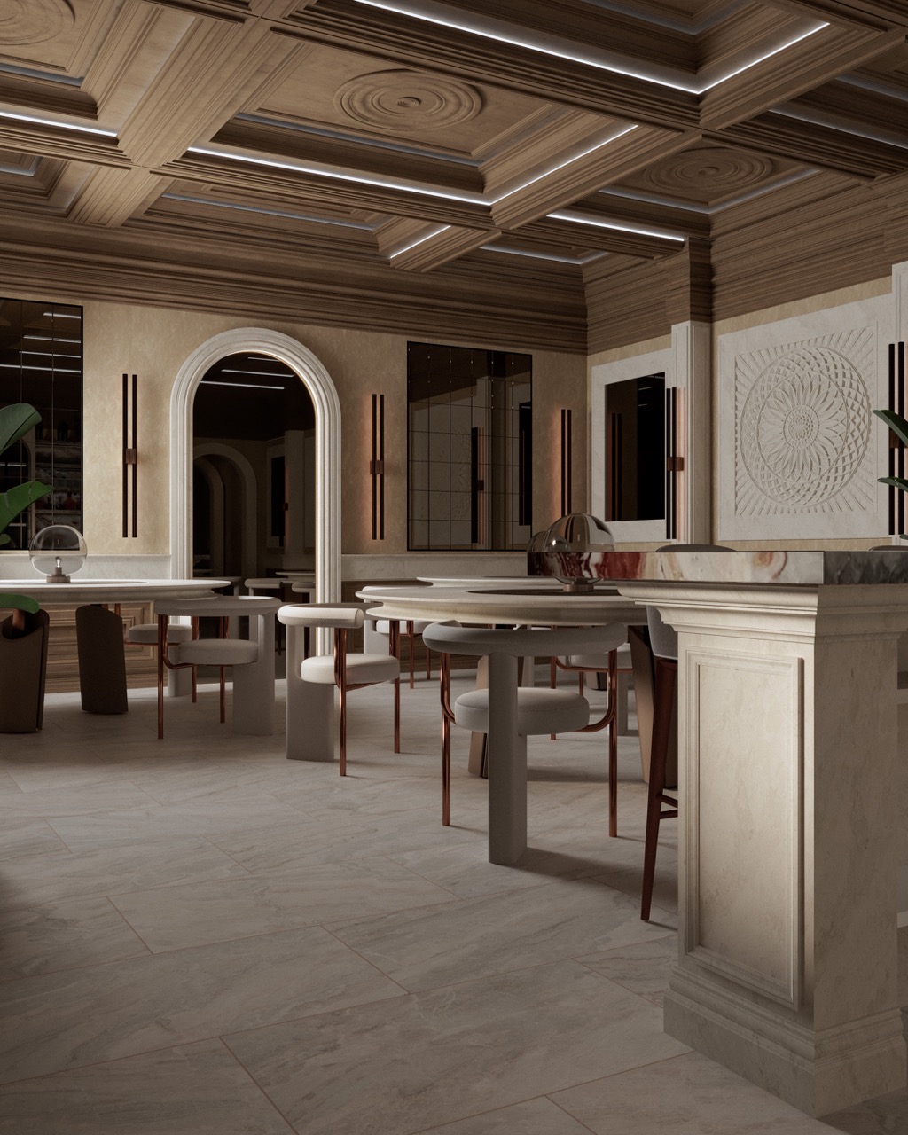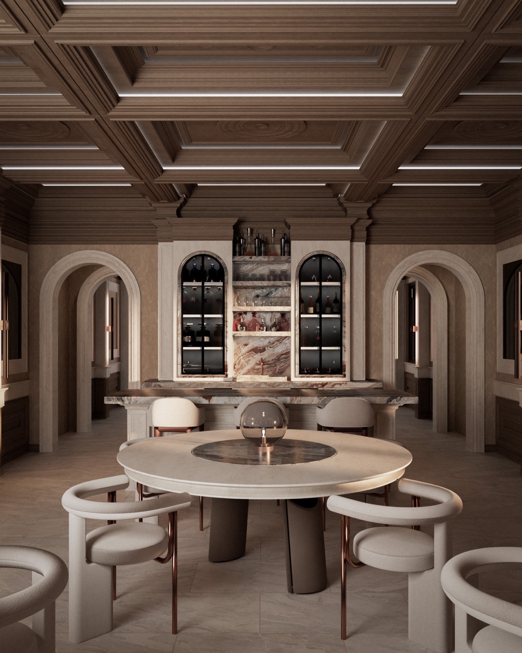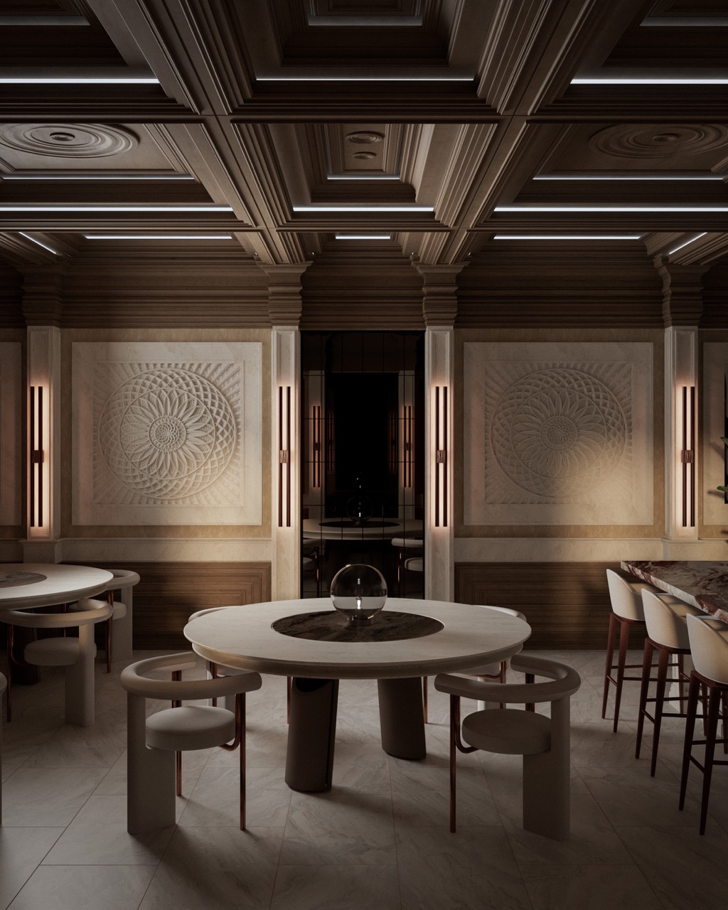 A restaurant-bar structured through strong symmetry and a sculptural stone bar — arches, wall panels and backlit displays establish the rhythm. The ceiling features deeply detailed coffers and layered moldings enhanced by linear lighting. Veined stone, wood, glass and metal compose a restrained beige palette. Mirrors and layered perspectives amplify depth — an immersive, intimate and architecturally precise atmosphere.