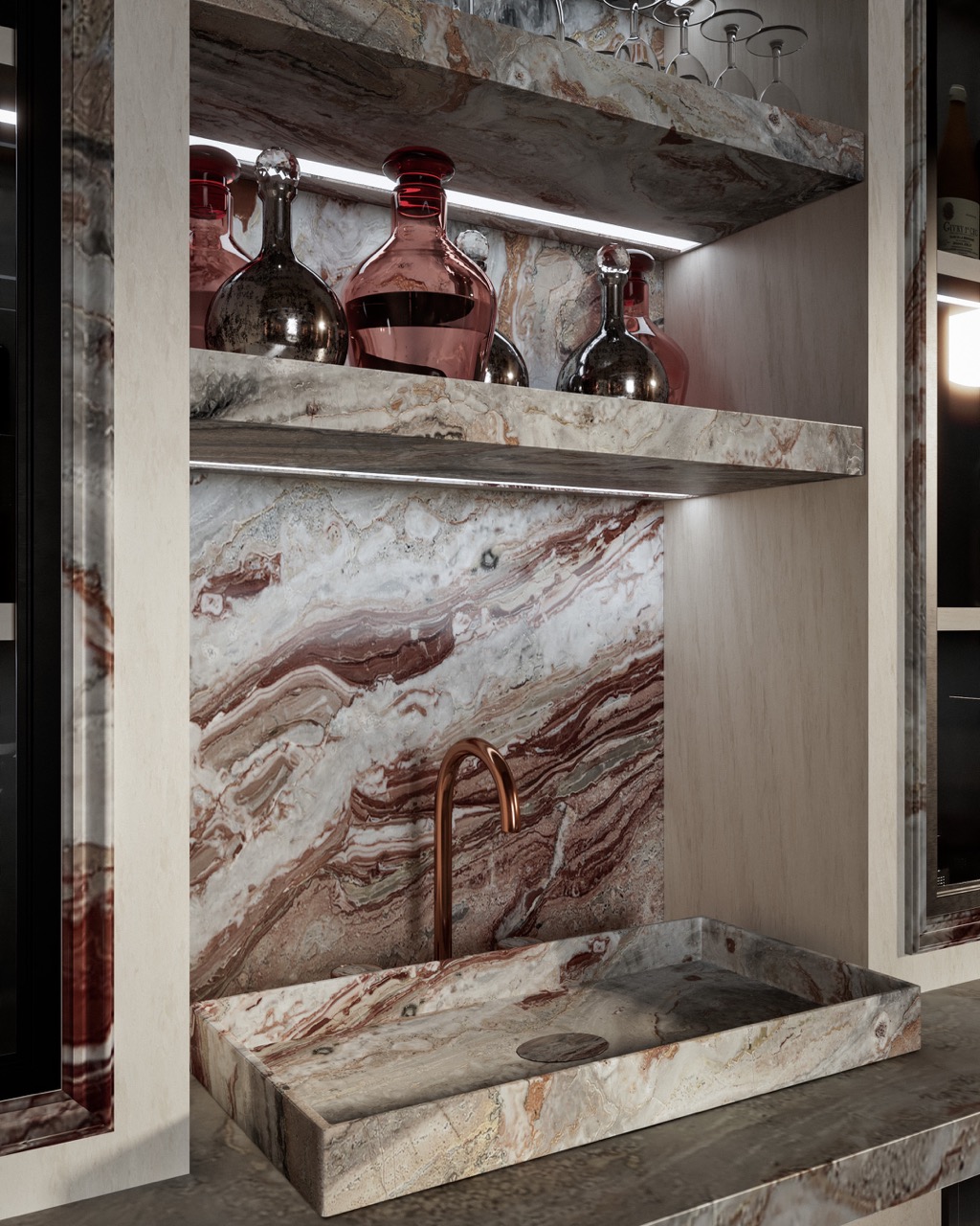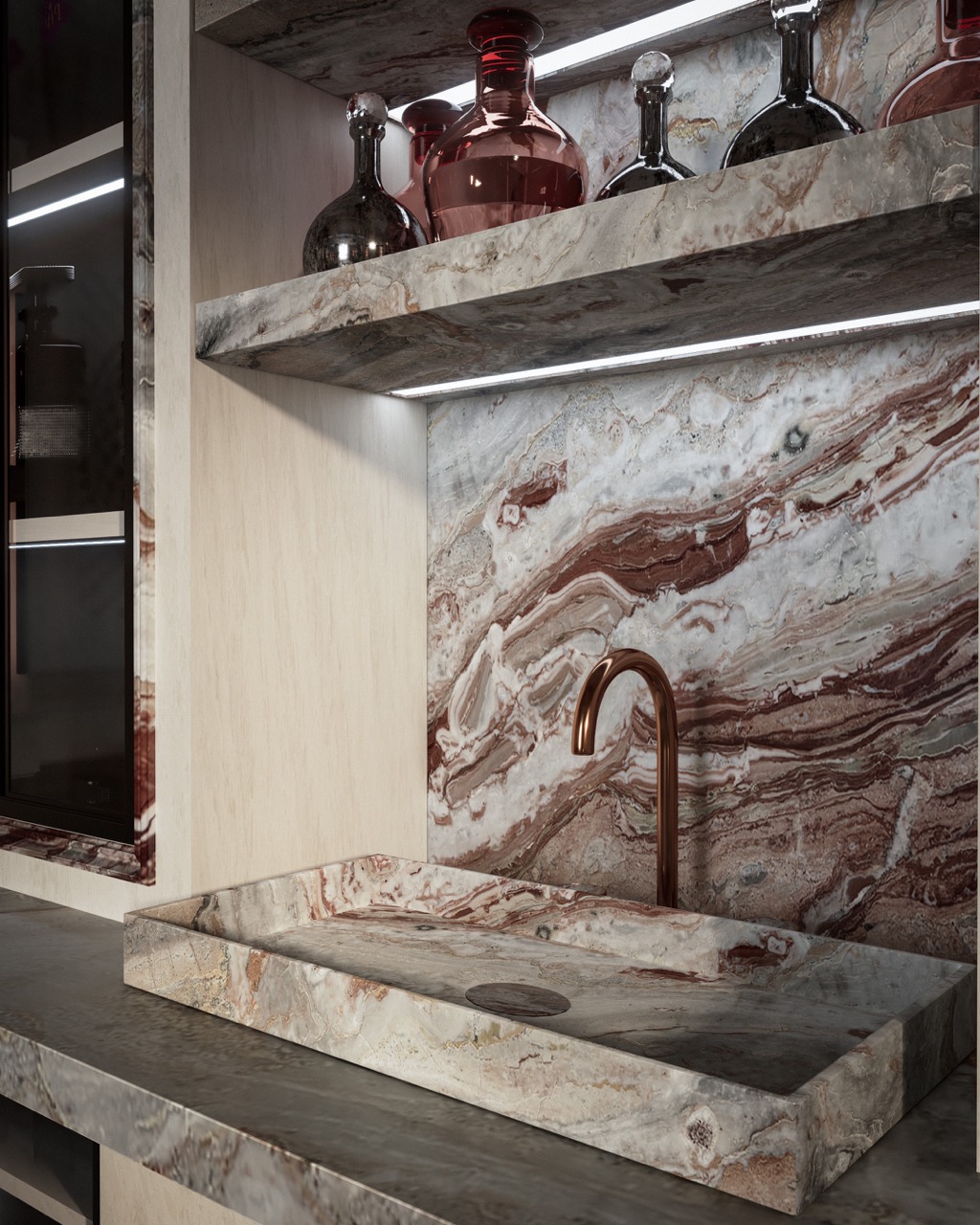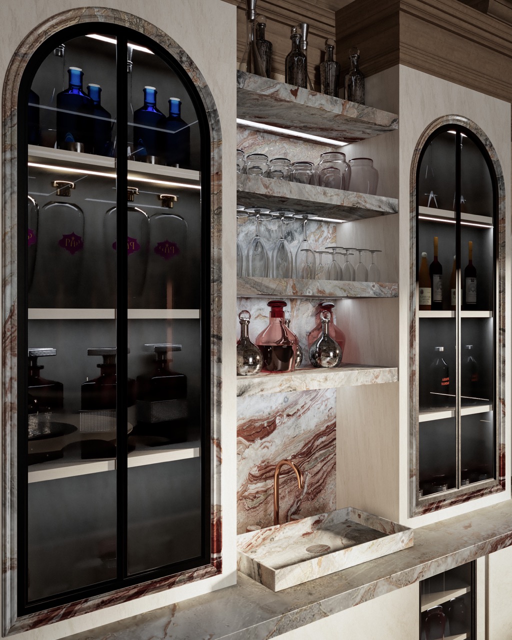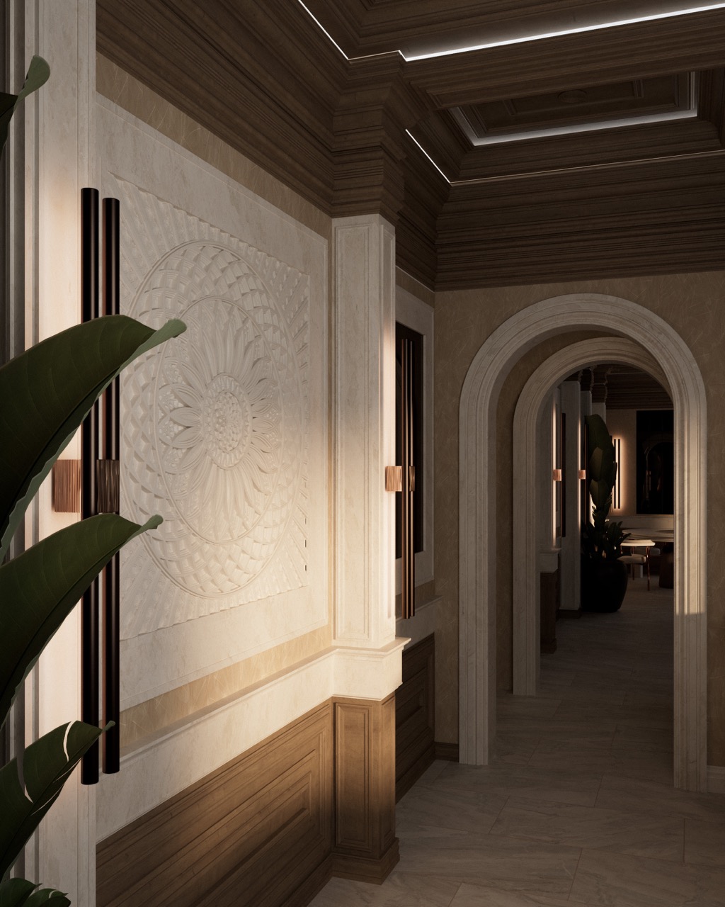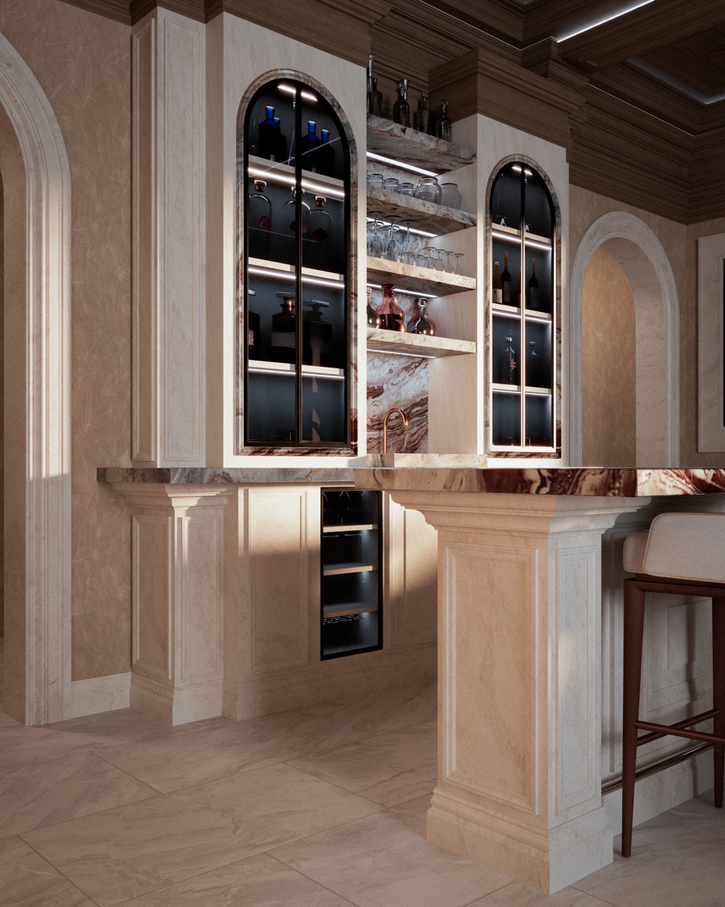 A restaurant-bar structured through strong symmetry and a sculptural stone bar — arches, wall panels and backlit displays establish the rhythm. The ceiling features deeply detailed coffers and layered moldings enhanced by linear lighting. Veined stone, wood, glass and metal compose a restrained beige palette. Mirrors and layered perspectives amplify depth — an immersive, intimate and architecturally precise atmosphere.